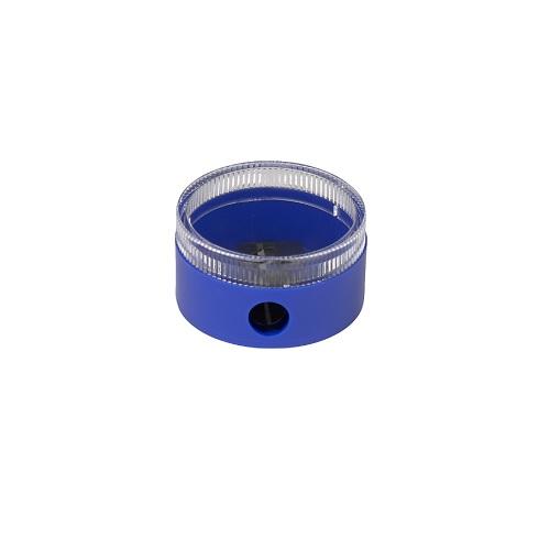 Round can-style sharpener for graphite and colored pencils with a twist closure.